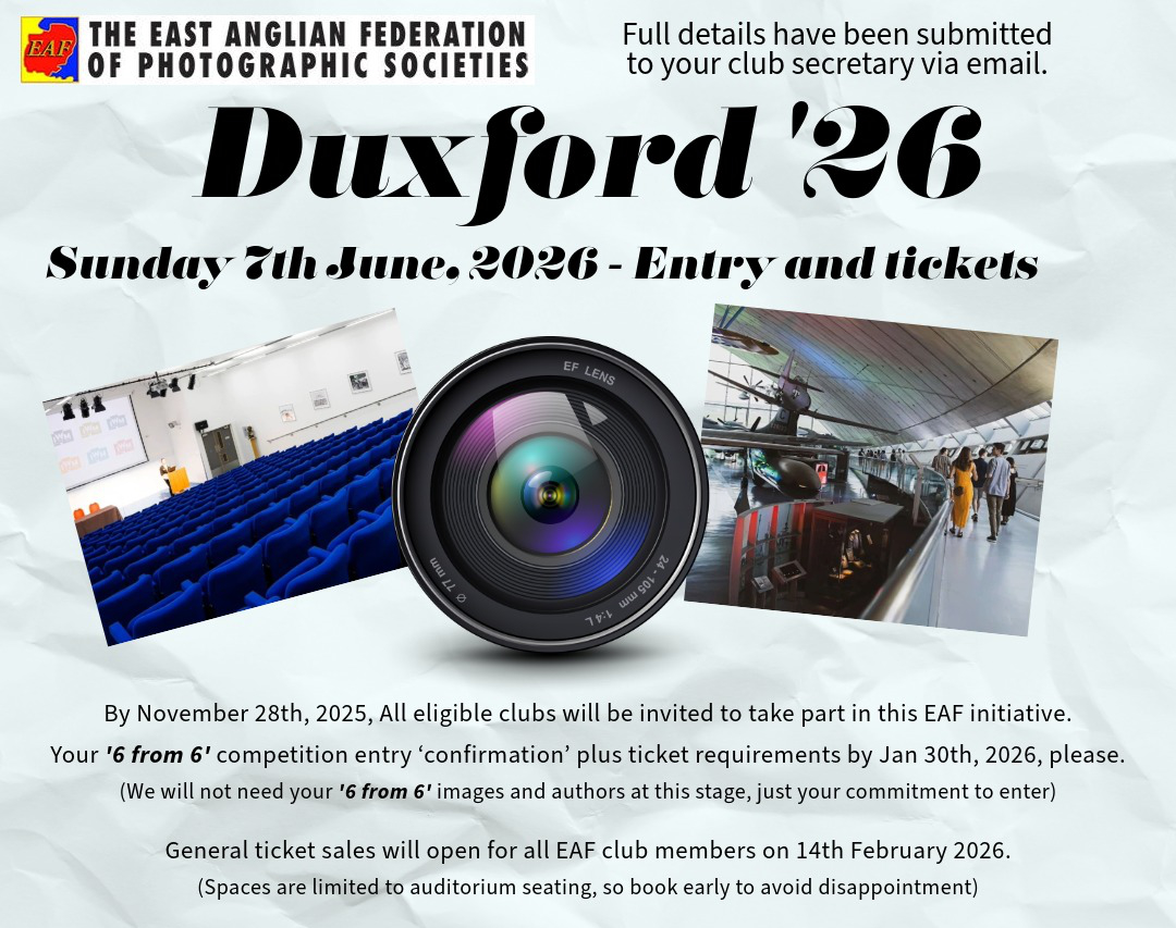 The EAF representatives at the PAGB Inter-Club Print Championship to be held in October will be PICO and Beyond Group who have qualified by reaching the final last year, along with Colchester PS and Ipswich & DPS. It is a good event, and our representatives would welcome some support. Tickets need to be bought in advance through the PAGB website.