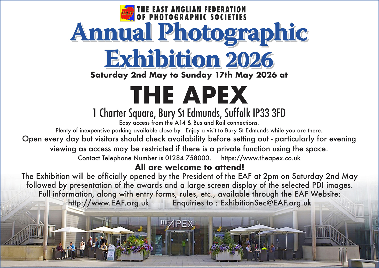 The EAF representatives at the PAGB Inter-Club Print Championship to be held in October will be PICO and Beyond Group who have qualified by reaching the final last year, along with Colchester PS and Ipswich & DPS. It is a good event, and our representatives would welcome some support. Tickets need to be bought in advance through the PAGB website.
